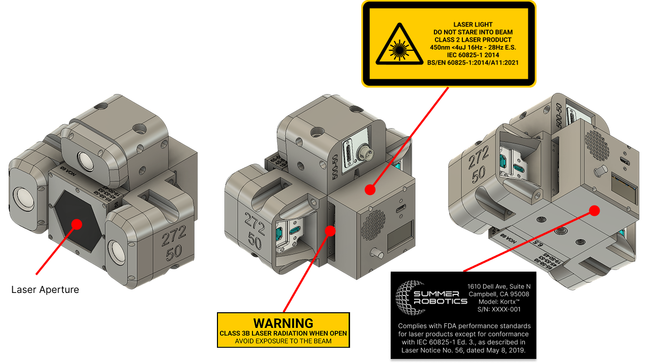 The Kortx™ is labeled in compliance with FDA 21 CFR 1040 and IEC 60825-1:2014 standards. The following sections show the required labels and their locations on the device.